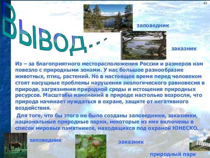 • Такие зоны сформировались на территории России уже в древние времена, но, из-за более теплого климата, зоны арктических пустынь и тундр отсутствовали. Затем климат похолодел, возникли ледники, и природные зоны сместились к югу. В горах образовалась четко выраженная высотная поясность – в высотой изменяются климат, состав почв, растительность и фауна. Фонд черноземных почв России составляет около 120 млн. га. Это всего лишь около 7% общей площади, но на ней размещается более половины всей пашни и производится около 80% всей земледельческой продукции. Россия богата природными ресурсами. В нашей стране находится самое глубокое озеро мира - Байкал, самая длинная река Европы – Волга, полюс холода Северного полушария – Оймякон. У нас есть горы, реки, болота и озера, леса и пустыни, богатейших растительный и животный мир