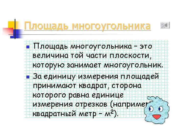 Свойства площадей n М F Равные фигуры имеют равные площади. Если F = М, то SF = SM