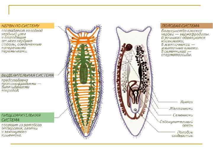 Плоские черви — принадлежат к наиболее просто устроенным трехслойным животным. Они имеют сплющенное в спинно-брюшном направлении тело и двустороннюю симметрию. Есть рот, но нет анального отверстия. Длина тела плоских червей колеблется от 0, 2 мм до 30 м. Этот тип объединяет 10 современных классов. Большинство из них— паразиты. Остальные три класса (в том числе ресничные черви) — свободноживущие. Известно около 13 000 видов плоских червей.