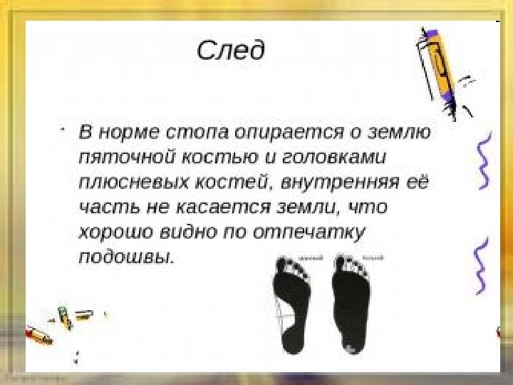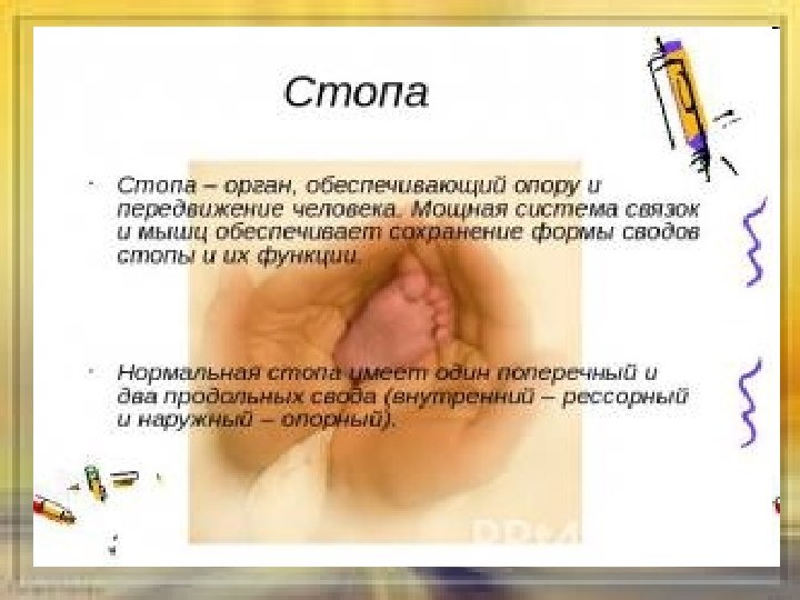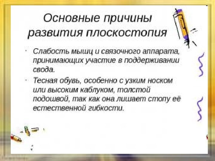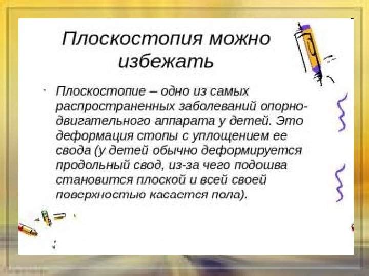 • Плоскостопие - деформация формы стопы с понижением ее сводов. По статистике более 65% детей уже к школьному возрасту приобретают плоскостопие. • Плоскостопие быстро прогрессирует и может вести за собой сколиоз, остеохондроз, радикулит, артроз, варикозное расширение вен и другие заболевания. Плоскостопие ускоряет износ всего опорнодвигательного аппарата
