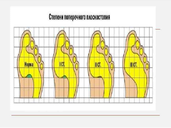 o o В зависимости от выраженности угла между I пальцем и I плюсневой костью выделяют следующие степени поперечного плоскостопия: I степень. Угол менее 20 градусов. Слабо выраженное плоскостопие. II степень. Угол от 20 до 35 градусов. Умеренно выраженное плоскостопие. III степень. Угол более 35 градусов. Резко выраженное плоскостопие.