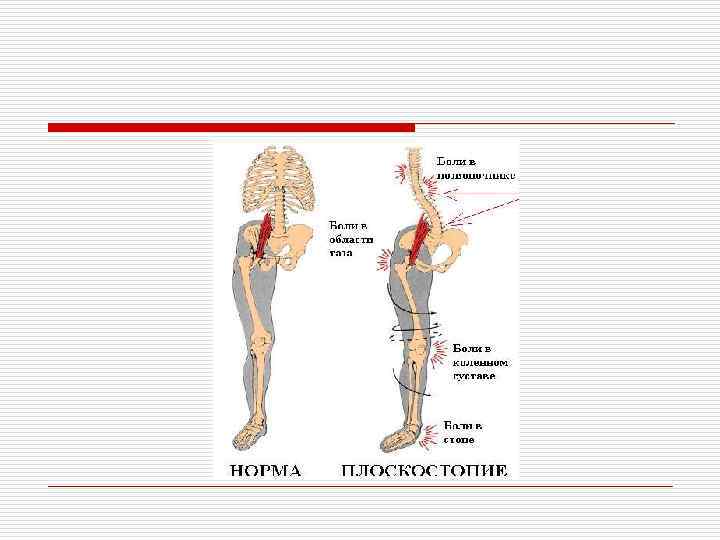 o o Наши стопы в норме выполняют 3 функции: амортизационная, балансировочная и толчковая. При ходьбе каждый шаг сопровождается ударом об какуюто поверхность, благодаря амортизирующей функции (сводам) - сила толчка равномерно распределяется по всей стопе. Но при плоскостопии «ударный импульс» не компенсируется сводами стопы (они отсутствуют) и наносит повреждения коленным, тазобедренным суставам и поясничному отделу позвоночника, возникают боли в коленях, тазе, позвоночнике. Балансировочная функция обеспечивает удерживание равновесия при движении и стоянии, но поскольку при плоскостопии нарушено взаиморасположение частей стопы, функция полностью не выполняется и при ходьбе может наблюдаться шаткость, неустойчивость, потеря равновесия. Толчковая функция обеспечивает ускорение при ходьбе. При этом происходит перераспределение нагрузки на передние отделы стопы и затем толчок. Но так как при плоскостопии часто отмечается болезненность, перенос центра тяжести и толчок одной точкой стопы непременно приводит к резкой боли и функция частично теряется.