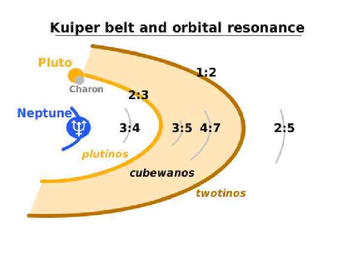 Количество ТНО и их типы • На сегодняшний день известно около 1500 ТНО с размерами примерно от нескольких сотен до тысячи км. • Как и астероидов, их может быть несколько миллионов • Объектов с диаметром более 100 км может быть более 100000. • Среди ТНО различают объекты: 1) Типа «плутино» , которые, как и Плутон движутся в резонансе 2: 3 с Нептуном (самые крупные – Плутон, Орк, Иксион); 2) Классический объект пояса Койпера, или "кьюбивано" ("cubewano"). Это название появилось от первого транснептунового объекта (ТНО) (15760) 1992 QB 1, обнаруженного за Плутоном и Хароном, орбита которого расположена за орбитой Нептуна (не пересекается с ней, т. е. им. небольшой эксц-т) и не находится с ним в орбитальном резонансе. Большая п-ось орбиты классических объектов пояса Койпера находится в интервале 40– 50 а. е. (т. е. за орбитой Плутона); 3) Объекты рассеянного диска (рассеянный диск – удалённый регион Солнечной системы, слабо заселённый малыми телами. Внутренняя область рассеянного диска частично перекрывается с поясом Койпера, а его внешняя граница находится намного дальше от Солнца, а также выше и ниже плоскости эклиптики.