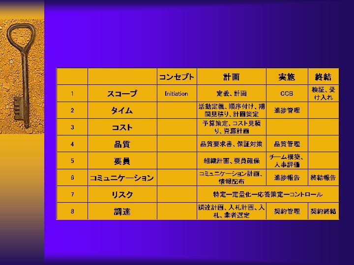 ¨ Scope planning – Statement • • • 目的記述書 Justification(正当性) 要求項目記述書 成果物 バックアップ資料(仕様書、設計図など) – Scope management plan • 稟議、承認 • 各種マネジメント会議規定(変更など) • 文書の更新と変更の通知手順