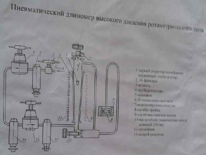 На рис. изображена схема пневматического длиномера высокого давления. Воздух из сети под давлением 0, 31 -0, 59 МПа (3, 2 -6, 0 кгс/см 2) поступает через вентиль 3, фильтр 2, первый редуктор 1, фильтр 14, второй редуктор 13 и отстойник 12 в трубку ротаметра 4. Положение поплавка 5 в трубке будет зависеть от зазора между калибром-пробкой 8 контролируемым изделием 7. У конической трубки длиномера имеются две шкалы: масштабная равномерная шкала 11 длиной 250 мм с миллиметровочными делениями и отсчетная шкала 9, градуируемая в микрометрах. Для установки поплавка в требуемое положение при данном зазоре и для изменения передаточного отношения прибора имеются два регулировочных игольчатых вентиля 6 и 10.