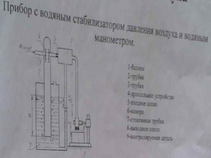 В верхней части трубы 2 находится дроссельное устройство 4, состоящее из пяти установленных последовательно сопел, ограничивающих поступление воздуха в трубу 2. Сжатый воздух вытесняет воду из трубы 2, избыток воздуха выходит через вожу пузырьками в атмосферу. Таким образом, независимо от давления воздуха, вырабатываемого компрессором, в трубе 2 устанавливается постоянное давление, зависящее от глубины погружения в воду трубы 2 и равное высоте водяного столба Н. Под этим рабочим давлением Н воздух поступает через входное сопло 5 в камеру 6 и выходит из измерительное (выходное) сопло 8. Давление в камере 8 обуславливается размером зазора z между торцом выходного сопла 8 и контролируемой деталью 9. Это давление определяется по разнице h уровней воды в баллоне 1 и стеклянной трубке 7, сообщающейся своей верхней частью с камерой 6, а нижней – с баллоном.