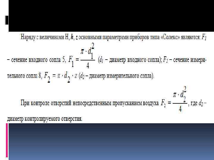 Непосредственно принцип действия Определение расхода воздуха через малое отверстие может быть использован для измерения размера небольших отверстий (от 0, 1 до 0, 4 мм): достаточно пропускать через измеряемое отверстие сжатый воздух под постоянным давлением и определять расход воздуха. В этом случае расход будет зависеть только от проходного сечения измеряемого отверстия. Т. е. в этом случае измеряется не размер отверстия, а площадь поперечного сечения.