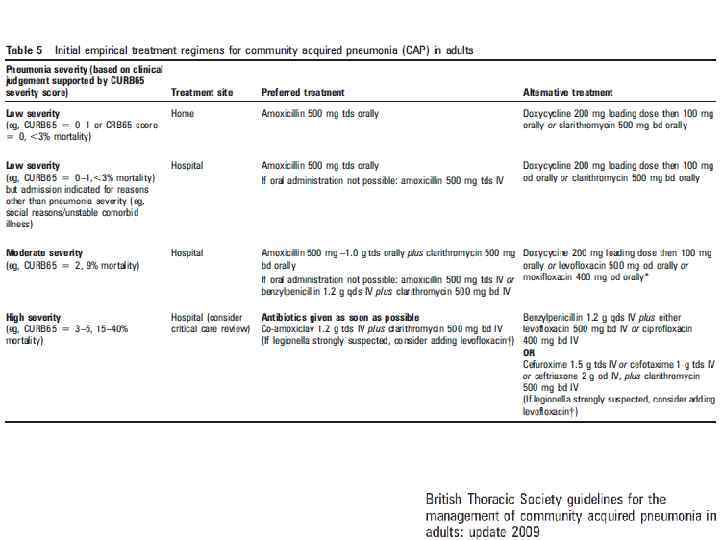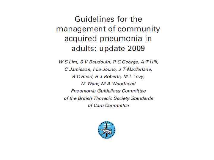 Критерии диагноза • Рентгенологически подтвержденная очаговая инфильтрация легочной ткани • Плюс хотя бы 2 клинических признака: – Острая лихорадка в начале заболевания (to>38, 0 o. C) – Кашель с мокротой – Физические признаки (укорочение перкуторного звука, жесткое везикулярное или бронхиальное дыхание, фокус крепитации и/или мелкопузырчатые хрипы) – Лейкоцитоз > 10 х 109/л и/или палочкоядерный сдвиг (>10%) Чучалин А. Г. , 2010