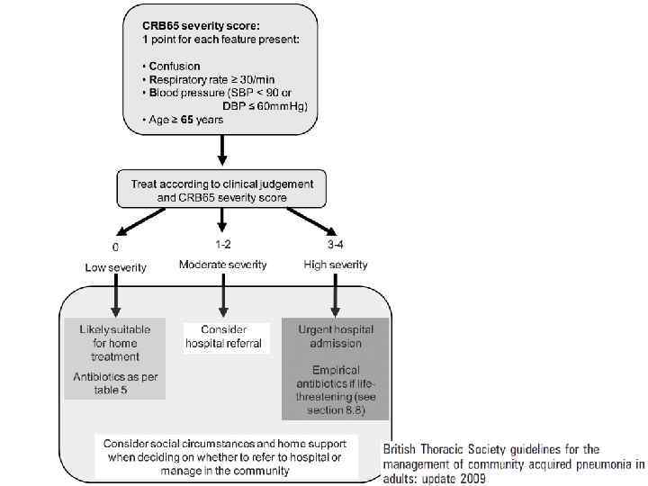 Критерии тяжести ВП При поступлении пациента с ВП в стационар необходимо, прежде всего, оценить тяжесть его состояния и решить вопрос о месте лечения (амбулаторно, стационарно в отделении общего профиля или ОРИТ). Для отбора больных ВП, которые могут лечиться амбулаторно, рекомендуется использовать шкалы определения тяжести ВП, такие как критерии Британского торакального общества (CURB-65) либо Американские критерии Pneumonia Severe Index – PSI. Оценка неблагоприятного исхода по шкале CURB-65: 1) Нарушение сознания (Confusion) 2) уровень мочевины крови > 7 ммоль/л (Urea) 3) частота дыхания ≥ 30 в мин (Respiratory rate) 4) низкое АД (систолическое < 90 мм рт. ст. или диастолическое ≤ 60 мм рт. ст. ) (Blood pressure) 5) возраст ≥ 65 лет (65). Суммарная оценка по шкале CURB-65 в пределах 0 -1 баллов предполагает лечение ВП в амбулаторных условиях, 2 балла – в стационаре в условиях отделения общего профиля, 3 и более баллов – в ОИТ.