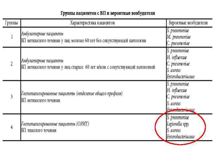 Наиболее распространенные возбудители ВП (рекомендации Американского общества инфекционистов/Американского торакального общества, 2007) Пациенты Возбудители Амбулаторные Streptococcus pneumonia Mycoplasma pneumonia Haemophilus influenza Moraxella catarrhalis Chlamydophila pneumonia Госпитализированные в стационар (не в S. pneuminiae ОИТ) M. pneumoniae C. pneumoniae H. influenzae Legionella spp. Госпитализированные в ОИТ S. pneumoniae Staphylococcus aureus Legionella spp. Грамотрицательные палочки H. influenzae
