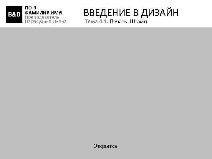 ПО-9 ФАМИЛИЯ ИМЯ Преподаватель Парасухина Диана ВВЕДЕНИЕ В ДИЗАЙН Тема 4. 1. Печать. Штамп Открытка