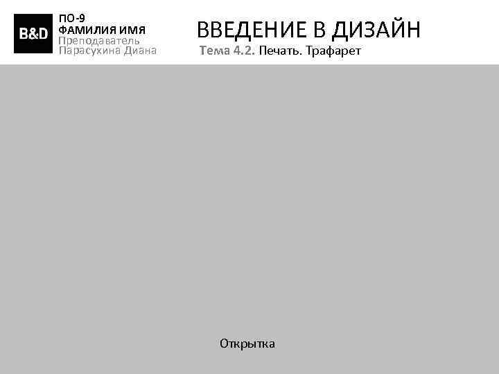 ПО-9 ФАМИЛИЯ ИМЯ Преподаватель Парасухина Диана ВВЕДЕНИЕ В ДИЗАЙН Тема 4. 2. Печать. Трафарет Открытка