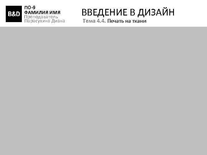 ПО-9 ФАМИЛИЯ ИМЯ Преподаватель Парасухина Диана ВВЕДЕНИЕ В ДИЗАЙН Тема 4. 4. Печать на ткани