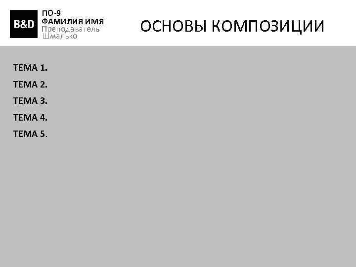 ПО-9 ФАМИЛИЯ ИМЯ Преподаватель Шмалько ТЕМА 1. ТЕМА 2. ТЕМА 3. ТЕМА 4. ТЕМА 5. ОСНОВЫ КОМПОЗИЦИИ