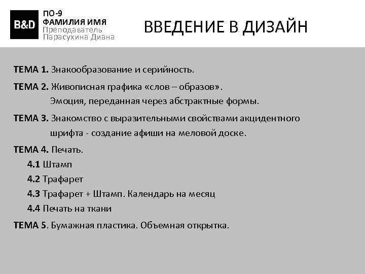 ПО-9 ФАМИЛИЯ ИМЯ Преподаватель Парасухина Диана ВВЕДЕНИЕ В ДИЗАЙН ТЕМА 1. Знакообразование и серийность. ТЕМА 2. Живописная графика «слов – образов» . Эмоция, переданная через абстрактные формы. ТЕМА 3. Знакомство с выразительными свойствами акцидентного шрифта - создание афиши на меловой доске. ТЕМА 4. Печать. 4. 1 Штамп 4. 2 Трафарет 4. 3 Трафарет + Штамп. Календарь на месяц 4. 4 Печать на ткани ТЕМА 5. Бумажная пластика. Объемная открытка.