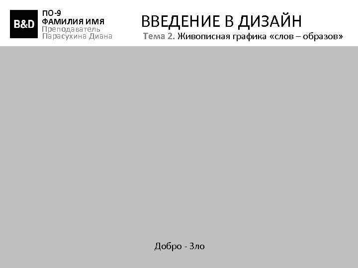 ПО-9 ФАМИЛИЯ ИМЯ Преподаватель Парасухина Диана ВВЕДЕНИЕ В ДИЗАЙН Тема 2. Живописная графика «слов – образов» Добро - Зло
