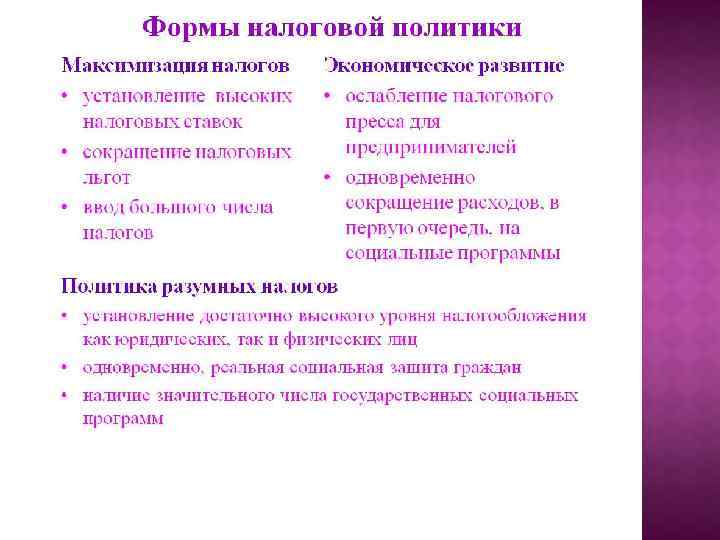 Налоговая политика - это составная часть социально-экономической политики государства, ориентированная на создание такой налоговой системы, которая должна стимулировать накопление и рациональное использование национального богатства страны, способствовать гармонизации интересов экономики и общества и тем самым обеспечить социальноэкономический прогресс общества.