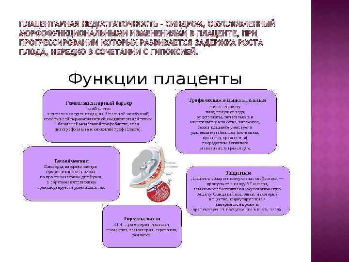 По клиническому течению: - Острая (чаще всего связана с отслойкой нрп или низко рп. , возникает преимущественно в родах). - Хроническая (может возникать в различные сроки беременности) А) компенсированная – нарушены метаболические процессы в плаценте, отсутствуют нарушения мпк и ппк. Б) декомпенсированная – нарушения мпк и ппк.