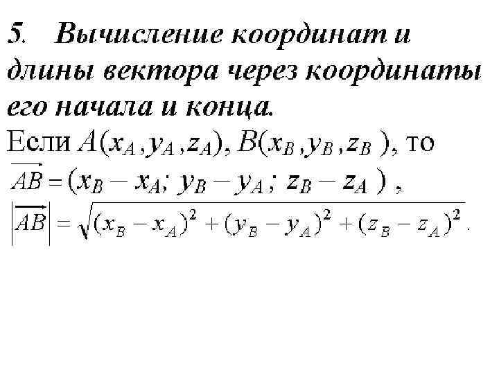 • Пример. Даны точки А(5, 3, – 2) и В(3, 0, 4). Записать вектор в системе орт и найти его длину.