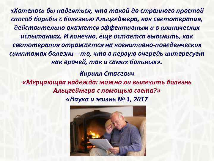 «Хотелось бы надеяться, что такой до странного простой способ борьбы с болезнью Альцгеймера, как светотерапия, действительно окажется эффективным и в клинических испытаниях. И конечно, еще остается выяснить, как светотерапия отражается на когнитивно-поведенческих симптомах болезни – то, что в первую очередь интересует как врачей, так и самих больных» . Кирилл Стасевич «Мерцающая надежда: можно ли вылечить болезнь Альцгеймера с помощью света? » «Наука и жизнь № 1, 2017