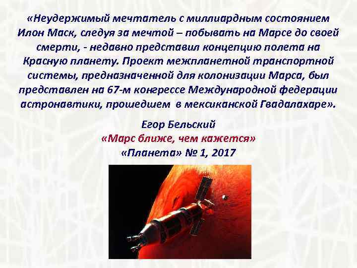 «Неудержимый мечтатель с миллиардным состоянием Илон Маск, следуя за мечтой – побывать на Марсе до своей смерти, - недавно представил концепцию полета на Красную планету. Проект межпланетной транспортной системы, предназначенной для колонизации Марса, был представлен на 67 -м конгрессе Международной федерации астронавтики, прошедшем в мексиканской Гвадалахаре» . Егор Бельский «Марс ближе, чем кажется» «Планета» № 1, 2017