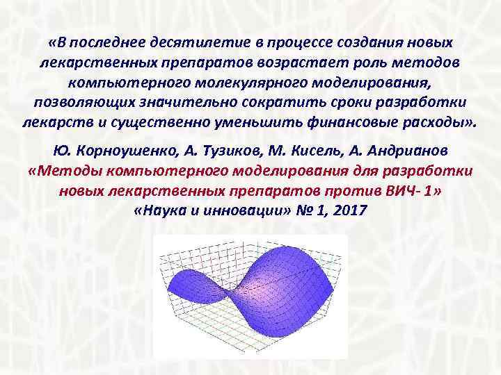 «В последнее десятилетие в процессе создания новых лекарственных препаратов возрастает роль методов компьютерного молекулярного моделирования, позволяющих значительно сократить сроки разработки лекарств и существенно уменьшить финансовые расходы» . Ю. Корноушенко, А. Тузиков, М. Кисель, А. Андрианов «Методы компьютерного моделирования для разработки новых лекарственных препаратов против ВИЧ- 1» «Наука и инновации» № 1, 2017