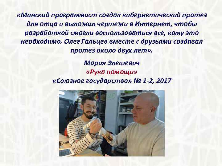 «Минский программист создал кибернетический протез для отца и выложил чертежи в Интернет, чтобы разработкой смогли воспользоваться все, кому это необходимо. Олег Гальцев вместе с друзьями создавал протез около двух лет» . Мария Элешевич «Рука помощи» «Союзное государство» № 1 -2, 2017