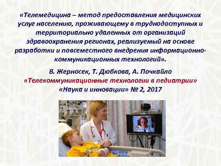 «Телемедицина – метод предоставления медицинских услуг населению, проживающему в труднодоступных и территориально удаленных от организаций здравоохранения регионах, реализуемый на основе разработки и повсеместного внедрения информационнокоммуникационных технологий» . В. Жерносек, Т. Дюбкова, А. Почкайло «Телекоммуникационные технологии в педиатрии» «Наука и инновации» № 2, 2017