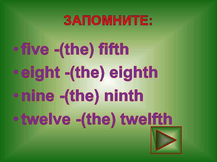 ЗАПОМНИТЕ: • five -(the) fifth • eight -(the) eighth • nine -(the) ninth • twelve -(the) twelfth