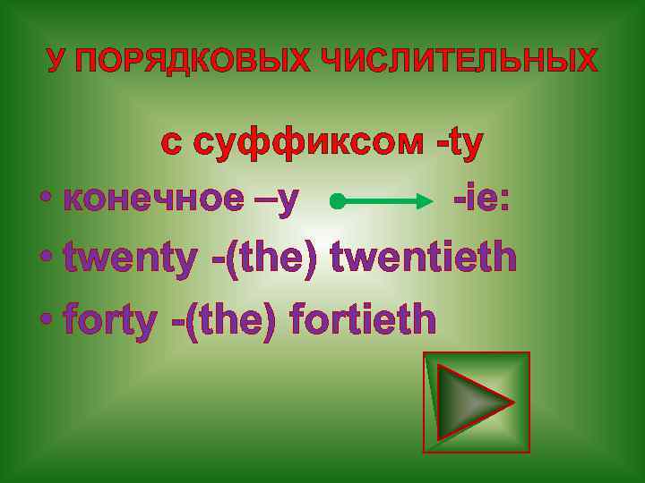 У ПОРЯДКОВЫХ ЧИСЛИТЕЛЬНЫХ с суффиксом -ty • конечное –у -ie: • twenty -(the) twentieth • forty -(the) fortieth