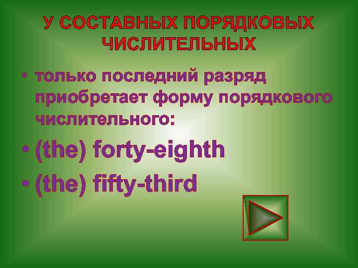У СОСТАВНЫХ ПОРЯДКОВЫХ ЧИСЛИТЕЛЬНЫХ • только последний разряд приобретает форму порядкового числительного: • (the) forty-eighth • (the) fifty-third