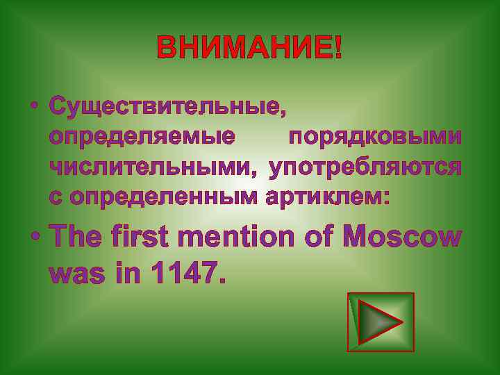ВНИМАНИЕ! • Существительные, определяемые порядковыми числительными, употребляются с определенным артиклем: • The first mention of Moscow was in 1147.