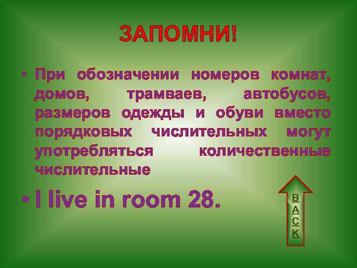 ЗАПОМНИ! • При обозначении номеров комнат, домов, трамваев, автобусов, размеров одежды и обуви вместо порядковых числительных могут употребляться количественные числительные • I live in room 28. B A C K