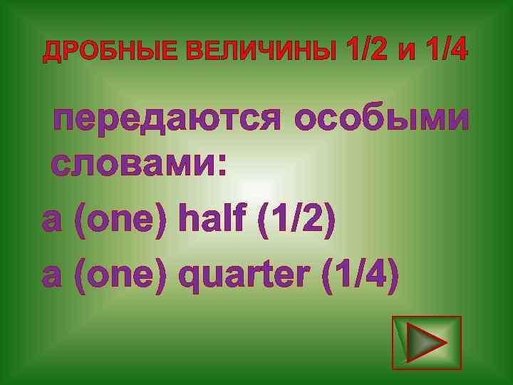 ДРОБНЫЕ ВЕЛИЧИНЫ 1/2 и 1/4 передаются особыми словами: a (one) half (1/2) a (one) quarter (1/4)
