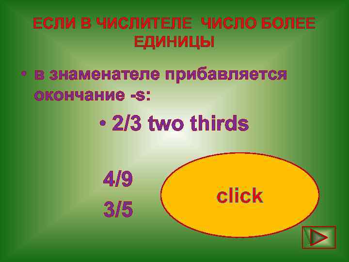 ЕСЛИ В ЧИСЛИТЕЛЕ ЧИСЛО БОЛЕЕ ЕДИНИЦЫ • в знаменателе прибавляется окончание -s: • 2/3 two thirds 4/9 four ninths click 3/5 three fifths