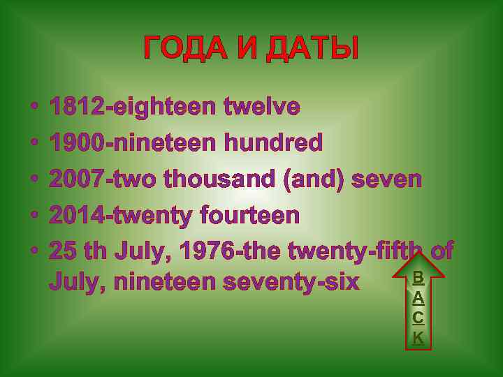 ГОДА И ДАТЫ • • • 1812 -eighteen twelve 1900 -nineteen hundred 2007 -two thousand (and) seven 2014 -twenty fourteen 25 th July, 1976 -the twenty-fifth of B July, nineteen seventy-six A C K