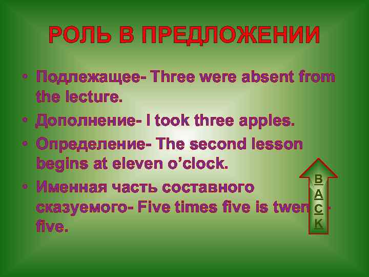 РОЛЬ В ПРЕДЛОЖЕНИИ • Подлежащее- Three were absent from the leсture. • Дополнение- I took three apples. • Определение- The second lesson begins at eleven o’clock. B • Именная часть составного A сказуемого- Five times five is twenty. C K five.