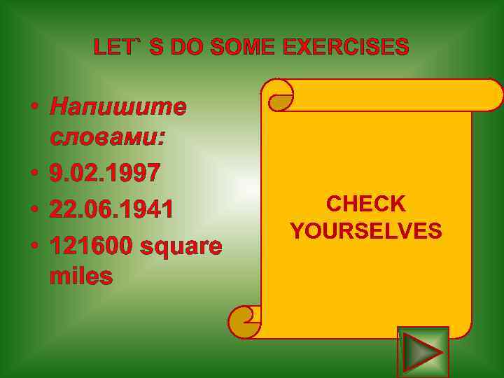 LET` S DO SOME EXERCISES • Напишите словами: • 9. 02. 1997 • 22. 06. 1941 • 121600 square miles • The ninth of February nineteen ninety seven • The twenty second of June nineteen CHECK forty one YOURSELVES • One hundred twenty one thousand six hundred square miles
