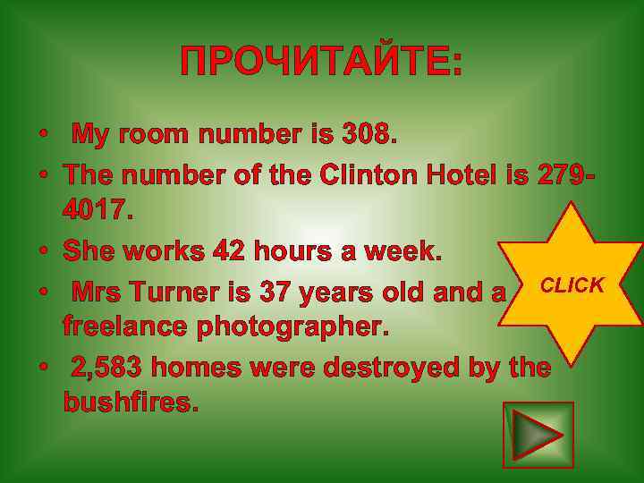 ПРОЧИТАЙТЕ: • My room number is 308. • The number of the Clinton Hotel is 2794017. • She works 42 hours a week. • Mrs Turner is 37 years old and a CLICK freelance photographer. • 2, 583 homes were destroyed by the bushfires.