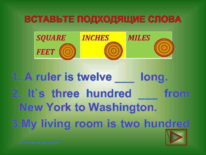 ВСТАВЬТЕ ПОДХОДЯЩИЕ СЛОВА SQUARE FEET 3 INCHES MILES 1 2 1. A ruler is twelve ___ long. 2. It`s three hundred ___ from New York to Washington. 3. My living room is two hundred ______.