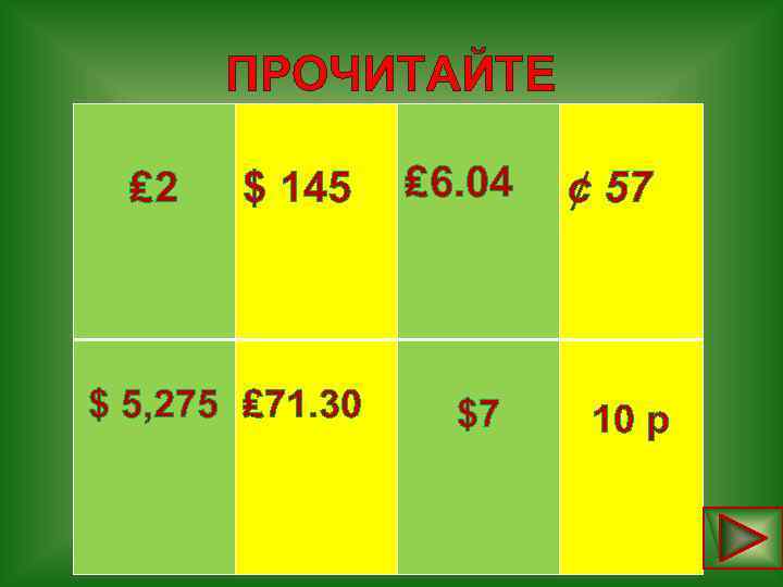 ПРОЧИТАЙТЕ ₤ 2 $ 5, 275 $ 145 ₤ 6. 04 17+3= 15*5= click 250/50= ₤ 71. 30 13*3= $7 100/5= ¢ 57 10 р
