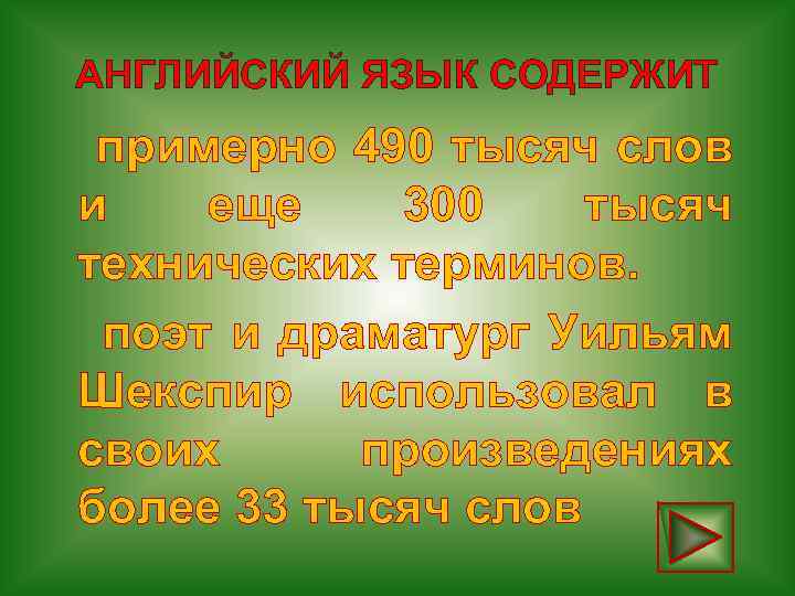 АНГЛИЙСКИЙ ЯЗЫК СОДЕРЖИТ примерно 490 тысяч слов и еще 300 тысяч технических терминов. поэт и драматург Уильям Шекспир использовал в своих произведениях более 33 тысяч слов