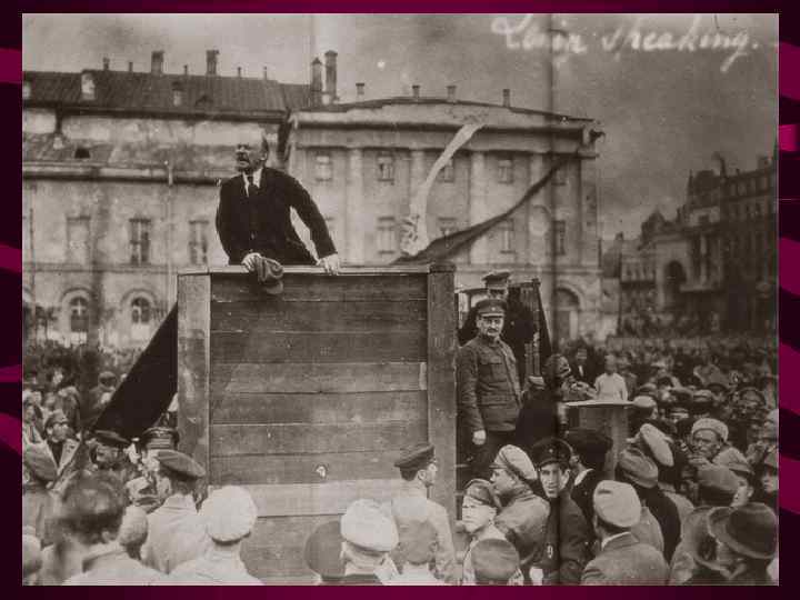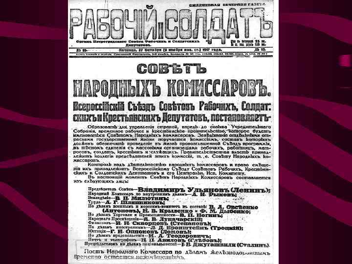 Второй съезд Советов Декрет о власти §ПРОВОЗГЛАШЕНА СОВЕТСКАЯ ВЛАСТЬ §ВЫСШИЙ ОРГАН ВЛАСТИ СЪЕЗД СОВЕТОВ, В ПЕРЕРЫВАХ ВЦИК § ИЗБРАН НОВЫЙ ВСЕРОССИЙСКИЙ ЦЕНТРАЛЬНЫЙ ИСПОЛНИТЕЛЬНЫЙ КОМИТЕТ (ВЦИК), в который вошли БОЛЬШЕВИКИ И ЛЕВЫЕ ЭСЕРЫ §ПРАВИТЕЛЬСТВО -СОВЕТ НАРОДНЫХ КОМИССАРОВ (СНК, СОВНАРКОМ) во главе с В. И. ЛЕНИНЫМ. В него вошли ТОЛЬКО БОЛЬШЕВИКИ Декрет о земле • ОТМЕНА ЧАСТНОЙ СОБСТВЕННОСТИ НА ЗЕМЛЮ; ЗЕМЛЯ – ОБЩЕНАРОДНОЕ ДОСТОЯНИЕ (собственность государства) • СДЕЛКИ С ЗЕМЛЕЙ И НАЕМНЫЙ ТРУД НА ЗЕМЛЕ ЗАПРЕЩЕНЫ • КОНФИСКАЦИЯ ПОМЕЩИЧЬИХ, УДЕЛЬНЫХ, МОНАСТЫРСКИХ ЗЕМЕЛЬ • ЗЕМЛИ ПЕРЕДАВАЛИСЬ В ПОЛЬЗОВАНИЕ ТРУДЯЩИМСЯ ПО РАВНОЙ НОРМЕ Декрет о мире 1) 3 -Х МЕСЯЧНОЕ ПЕРЕМИРИЕ 2) НЕМЕДЛЕННЫЕ ПЕРЕГОВОРЫ О МИРЕ БЕЗ АННЕКСИЙ И КОНТРИБУЦИЙ 3) ОТМЕНА ТАЙНОЙ ДИПЛОМАТИИ, ОБНАРОДОВАНИЕ ТАЙНЫХ ДОГОВОРОВ