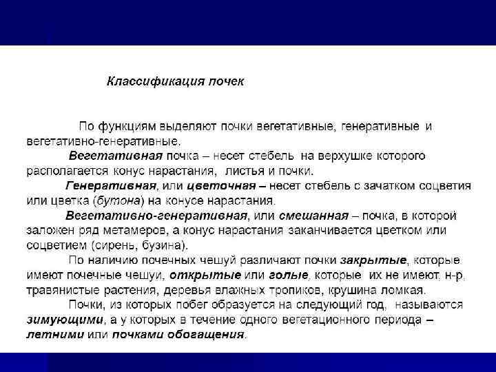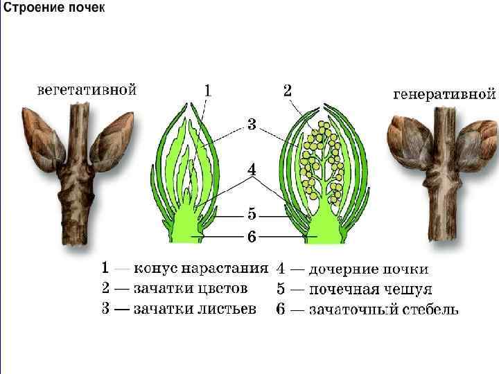 По содержанию почки могут быть вегетативные (образующие только побег с листьями и почками) и генеративные (цветочные) (образующие побег с цветком или соцветием). Цветочные почки обычно крупнее вегетативных. Например, у вяза, цветочные почки крупные шаровидные, а вегетативные – острые. Вегетативная почка Генеративная почка