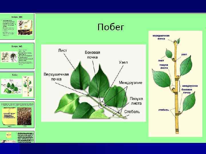 Стебель с листьями и почками принято называть побегом. Главный побег развивается из зародышевого стебелька. Затем из боковых почек на нем развиваются боковые побеги, образуя побеговую систему (ветвление). Участок стебля, где прикрепляется лист, называется узлом, а часть стебля между двумя узлами – междоузлием; угол между стеблем и листом – пазухой листа, в которой закладываются новые почки ( из них, на следующий год, развиваются боковые побеги). Почки, которые закладываются вне пазухи листьев, а также на других органах (корнях, листьях), называются придаточными. Почка, образующаяся на вершине побега, и обуславливающая рост стебля называется верхушечной. . . Побег: 1 – узел, 2 – междоузлие, 3 – лист, 4 – пазушная (боковая) почка, 5 – верхушечная почка, 6 – пазуха листа. А – побег с длинными междоузлиями, Б – побег с короткими междоузлиями