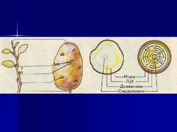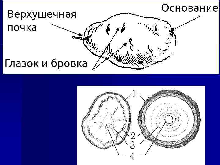 Клубнями называют сильно утолщенные мясистые побеги с крупноклеточной запасной паренхимой, клетки которой заполнены крахмалом. Листья полностью редуцированы, но в пазухах находятся почки – глазки, из которых развиваются новые побеги. На поперечном разрезе можно увидеть все слои стебля: кожица, пробка, луб, камбий, древесина и сердцевина. Клубни образуются на концах удлиненных подземных стеблях – столонах ( картофель ). В нашей стране выращивают картофель и топинамбур (земляная груша) для получения клубней