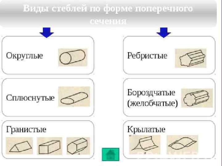 По форме поперечного сечения выделяют: а) Округлые (у большинства растений), б) Трехгранные (осоковые), в) Четырехгранные (губоцветные), г) Многогранные (зонтичные, кактусы), д) Крылатые (чина), е) Плоские (опунция). По состоянию поверхности стебли бывают: а) Гладкие, б) Опушенные, в) Клейкие, г) Бороздчатые, д) С шипами и иглами.