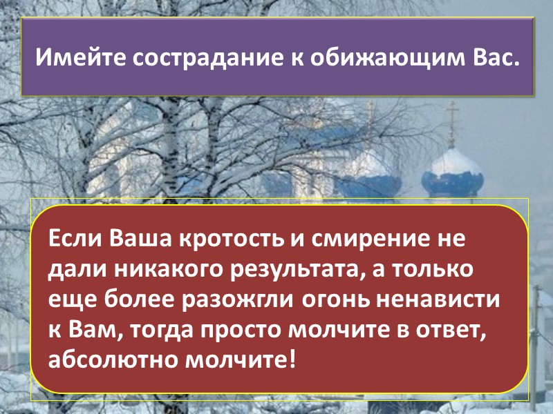 Не дивись тогда, если и часто будут повторяться тебе грубости от оскорбляющих тебя, ибо они заметят твою слабость и будут намеренно раздражать тебя. Не побежден бывай от зла, но побеждай благим злое. Покажи оскорбившему тебя, что он не тебя обидел, а сам себя, пожалей его сердечно