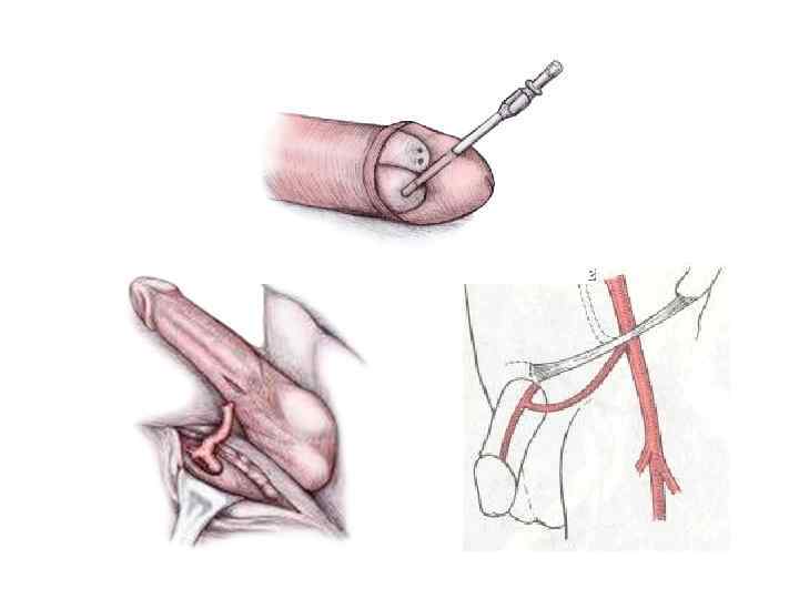 Лечение ишемического приапизма 1. Приапизм, продолжающийся менее 6 часов. Стандартная консервативная терапия: применение холода, транквилизаторы (в/м и в/в инъекции реланиума), средства, улучшающие реологию крови. 2. Приапизм, продолжающийся свыше 6 часов. На этом этапе проводится: - аспирацияи крови и ирригация пещеристых тел теплыми растворами последовательное применение аспирации/ирригации и интракавернозных инъекций адренэргических препаратов (эффективность использования составляет 77%) Смысл проведения данных манипуляций в декомпрессии кавернозных тел и восстановлении гемодигамики 3. Приапизм, продолжающийся более 48 часов. Выполняется один из видов шунтирующих операций: • кавернозное тело - губчатое тело уретры; • кавернозное тело - большая подкожная вена бедра; • кавернозное тело - головка полового члена.