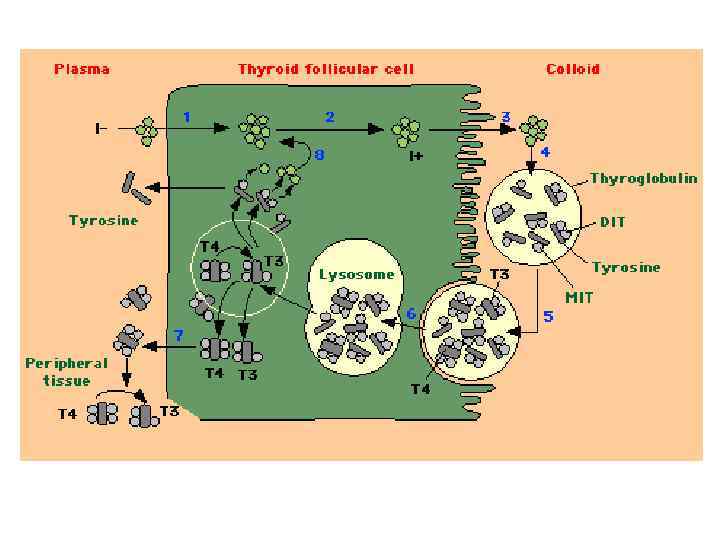 Транспорт гормонов щитовидной железы • Тироксинсвязывающий глобулин (TBG) — ~75% • Тироксинсвязывающий преальбумин (транстиретин, TBPA) — 15 -20% • Альбумин • Липопротеиды ~5 -10% • Только ~0. 03% общего T 4 и ~0. 3% общего T 3 находятся в крови в свободном состоянии I OH O OH I Тироксин (T 4) I NH 2 I O OH O I 3, 5, 3’-Трийодтиронин (T 3) I NH 2 I O OH